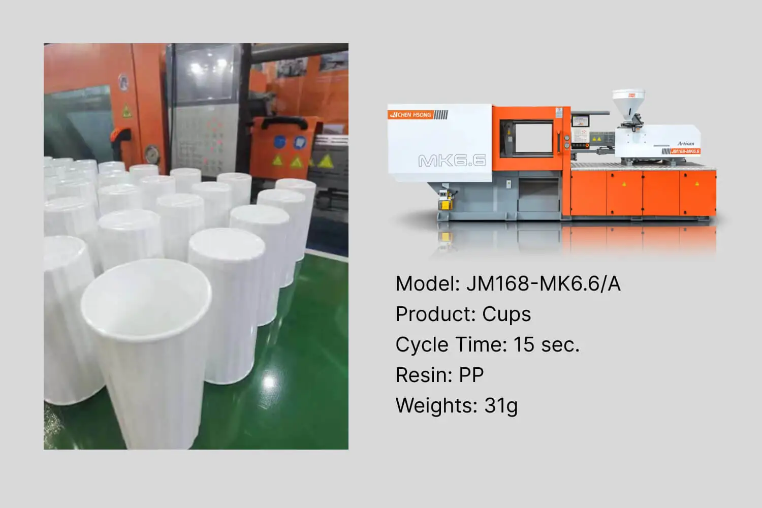 Our JM168-MK6.6/A also showcased its precision and performance. This state-of-the-art injection moulding machine produced PP resin cups with a cycle time of 15 seconds and a weight of 31g each. Its wide clamping force range, innovative CPC6.6 controller, and advanced motion-control algorithms left a significant impression on the attendees, marking it as a key player in the future of the plastic and packaging industry.