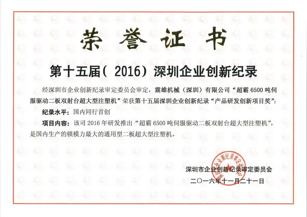 第十五届深圳企业创新纪录成果发布会于 2017 年 1 月 6 日由深圳工业总会主办举行,震雄凭借旗下“超霸” 6,500 吨伺服驱动二板式超大型双射台注塑机荣获《第十五届 (2016) 深圳企业创新纪录 — 产品研发创新项目奖》。