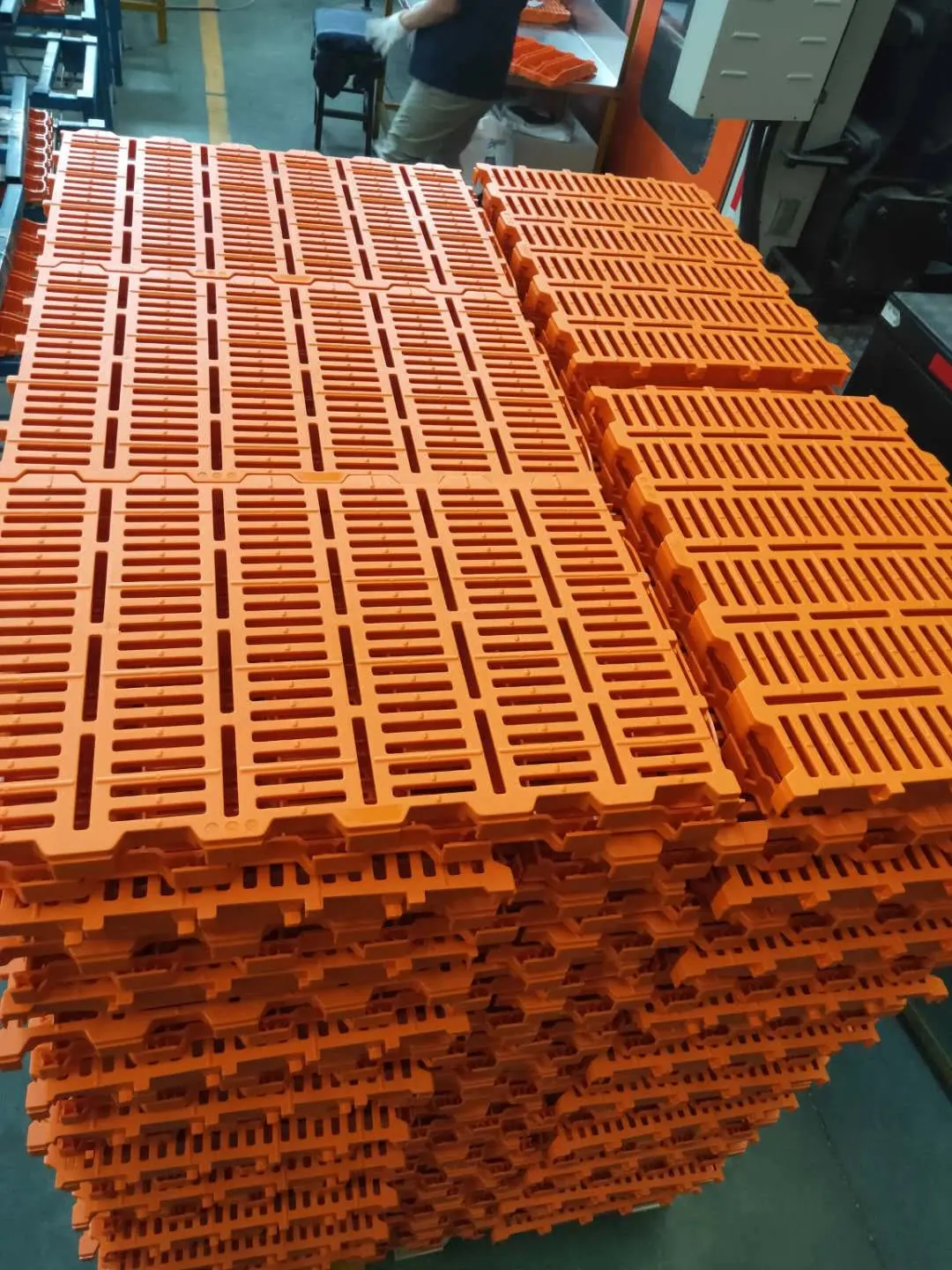 猪舍地板即漏粪板,震雄 JM800-MK6 大型注塑机生产的漏粪板具有高强度、耐腐蚀、无异味、漏粪孔光滑(表面平整光洁不易伤害猪群脚趾和皮肤)、良好的绝缘性、抗老化、不蓄水、不粘粪、使用寿命长、易于安装等特点。从而改善猪的生存环境,利于猪的健康成长,是猪场建设的首选地板材料,真真正正地为养猪户实现小猪“配齐”的美好生活。