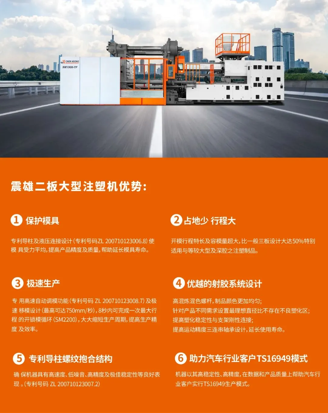 震雄通过 60 多年的技术积累,针对新能源汽车的特点量身定制的二板大型注塑机,就可以助力汽车加速在新能源汽车的布局。