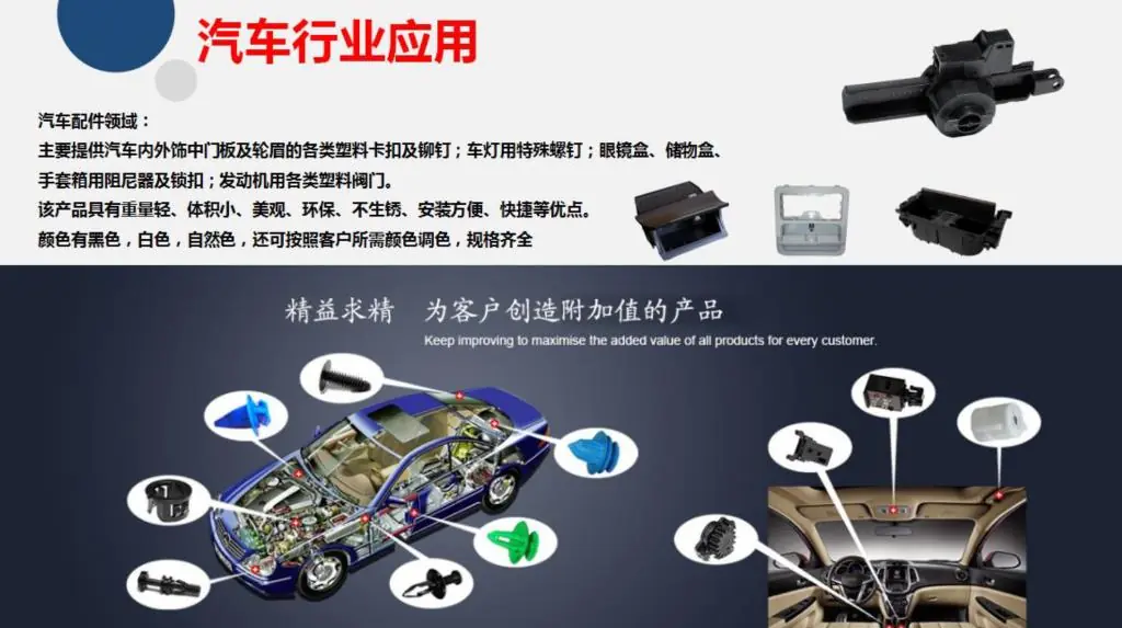 集团自创立以来,不断汲取各类塑料紧固件、标准件和精密塑胶件之优势,不断提升研发、设计、生产、销售的实力,不断提升品在汽车、通讯、家居、电器、调音器产品上之运用,并极力拓展汽车后市场、及延伸基于改善人们生活、同时开发高质量、价格合理之产品,为国内目前标准化产品最多的厂商之一。
