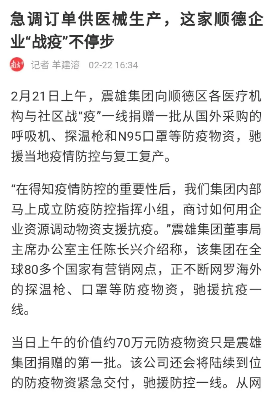 震雄集团 500 万元爱心助力战“疫”,子公司震德捐赠首批 70 万元医疗物资