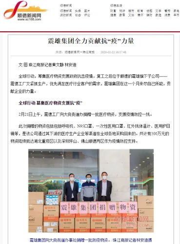 2 月 21 日上午,震雄集团向大良街道捐赠购置的第一批医用物资,支援疫情防控一线。此次捐赠物资包括呼吸机、N95 口罩、一次性医用口罩、红外线体温计、医用护目镜等,共计价值约 70 万元。