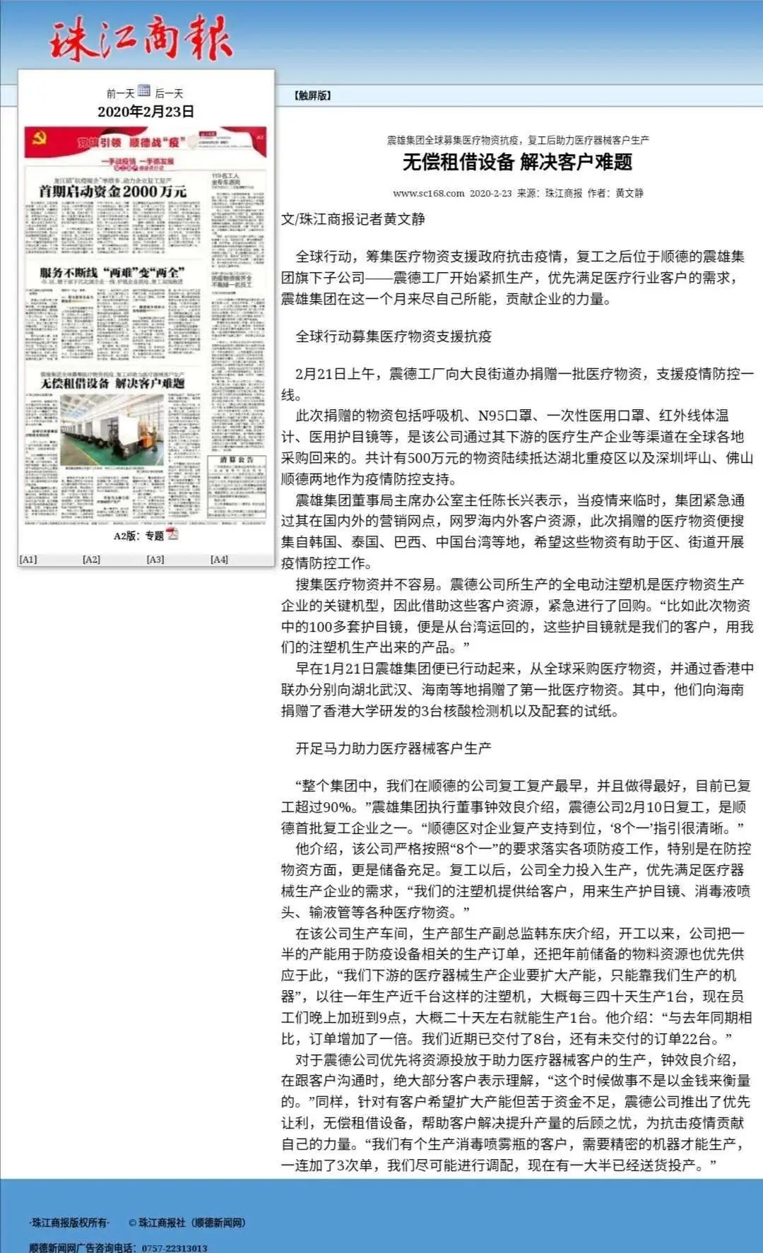 当日,多家主流媒体南方日报、珠江商报、顺德电视台、顺德电台、顺德城市网聚焦震德工厂,争相报道震雄为“防疫生产两不误”的优秀企业典范。