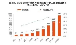数据显示,2012-2018 年,我国互联网医疗行业市场规模迅速发展,从 67 亿元增长至 491 亿元,年均复合增长率达到 39.37%,反映出我国医疗市场对互联网医疗的迫切需求。按照这一增幅,2020 年行业规模将突破 940 亿元,行业未来将进入规范化发展的高速增长期。